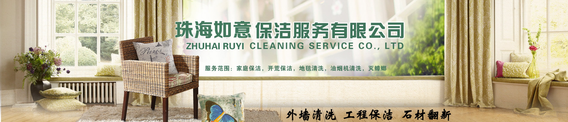 珠海市如意清潔主營:外墻清洗、地毯清洗、石材護(hù)理翻新、企業(yè)保潔、開荒清潔、屋面防水、油煙管道清洗。家庭保潔,物業(yè)保潔,小區(qū)物業(yè)保潔,樓盤開荒,沙發(fā)清潔,地板打蠟,(建筑、汽車玻璃貼膜)。